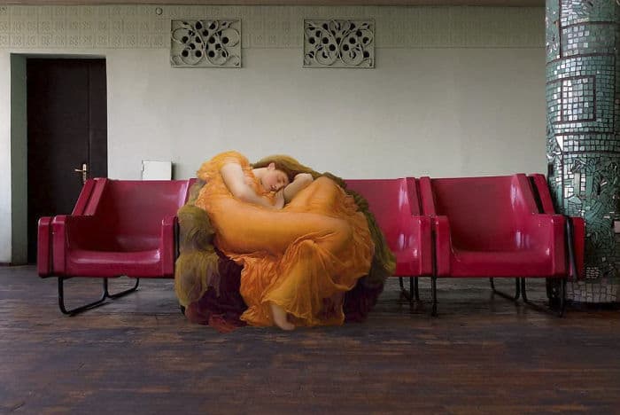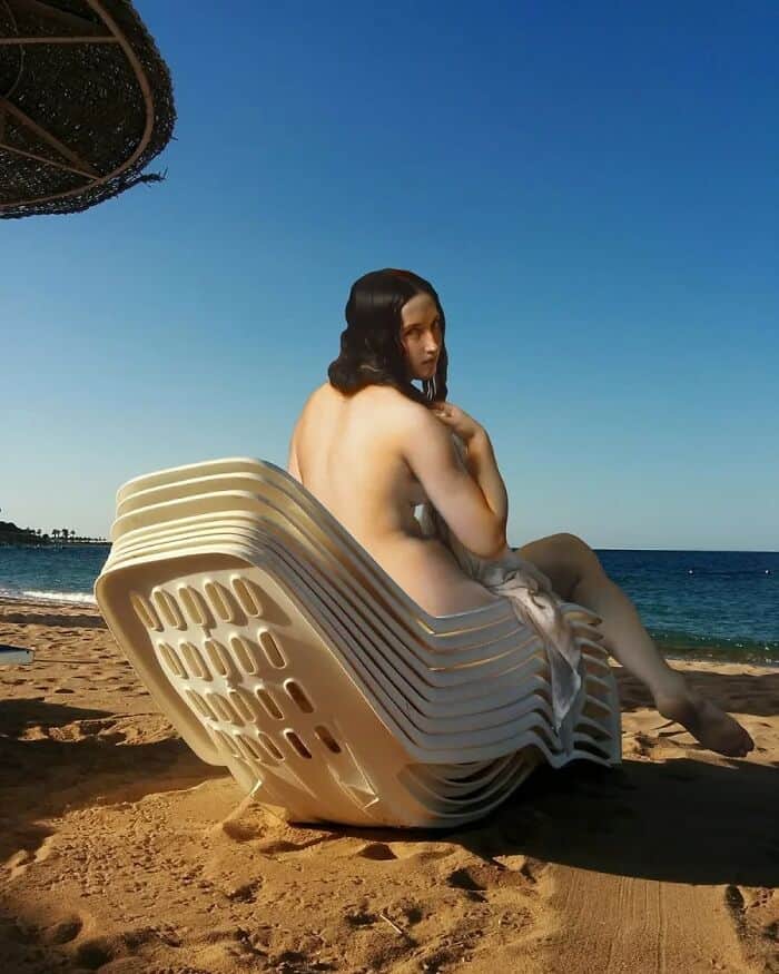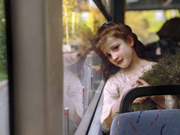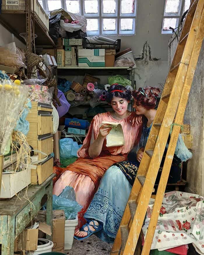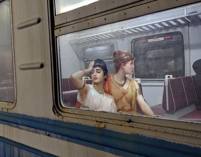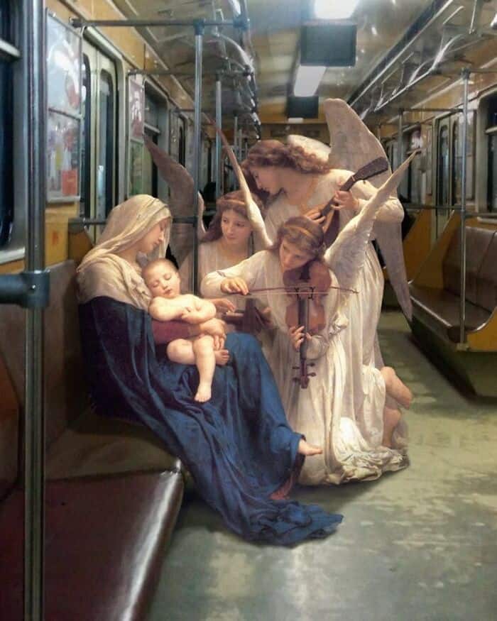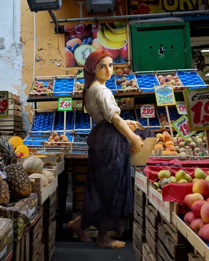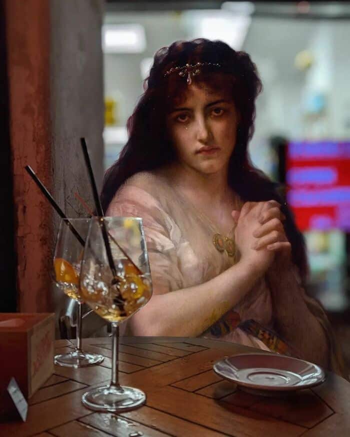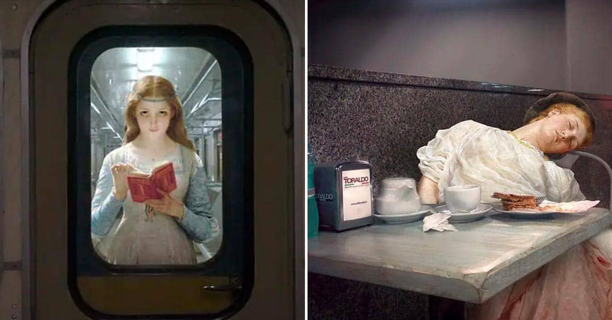 His series asks a simple but brilliant question: what if the people from classical paintings suddenly showed up in modern life?
