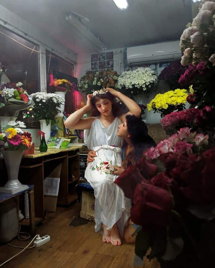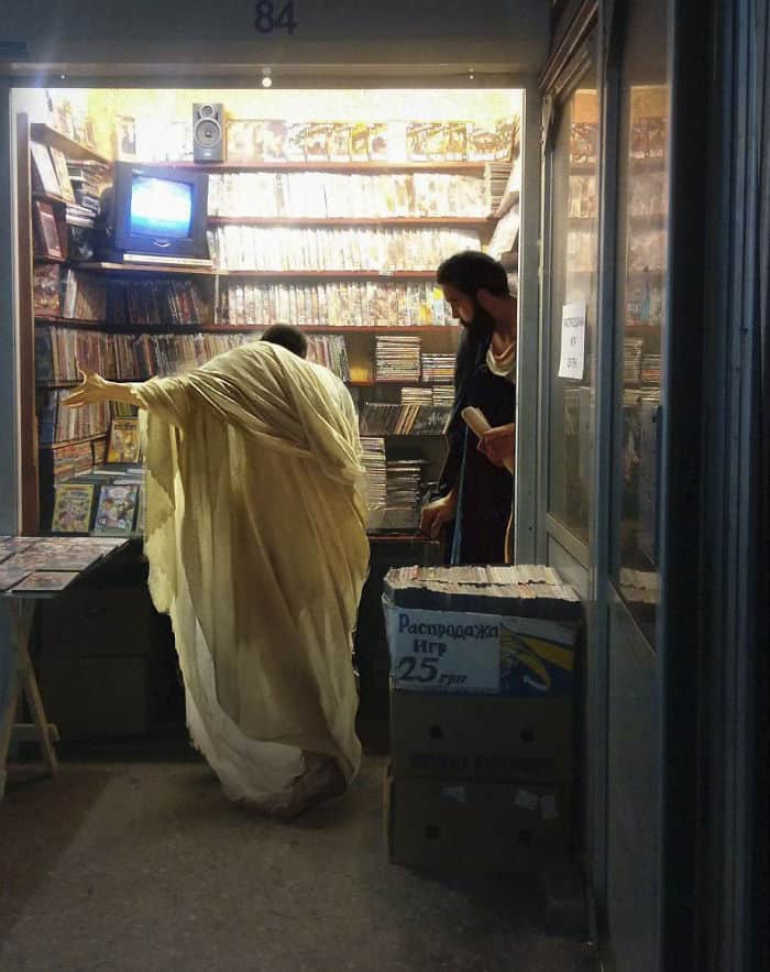 By dropping these dramatic, centuries-old characters into everyday scenes. Subways, grocery stores, city streets… Kondakov creates images that are both hilarious and strangely beautiful.
