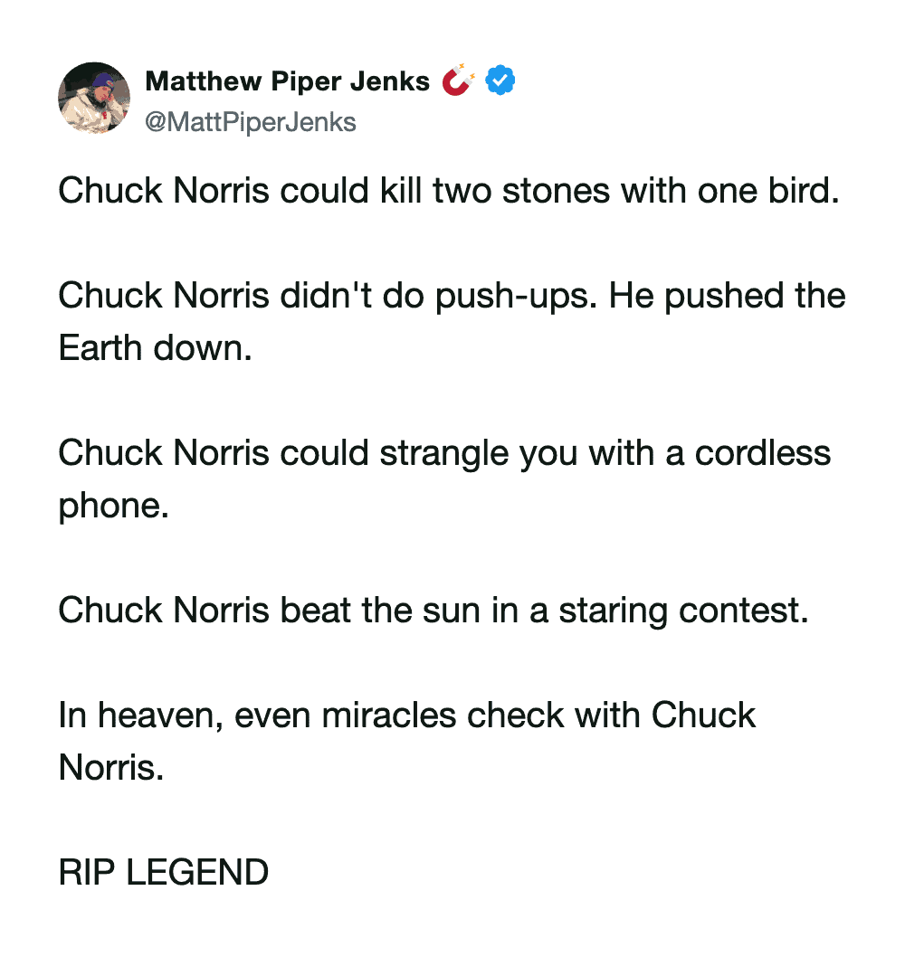 I remember when Chuck Norris jokes were basically the entire internet. You’d log on, and someone had a new one, and it was the funniest thing you’d ever read, until the next one. He was the original meme before we had a word for it, and the best part was that none of the jokes were ever mean. Every single one was about how unbelievably awesome he was. That was the whole bit.