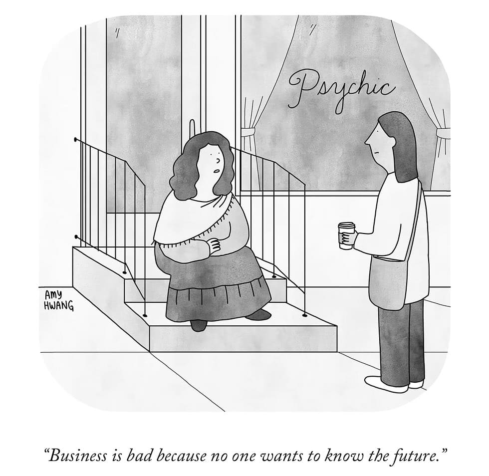 That’s exactly why I enjoy Amy Hwang’s work in The New Yorker. Her comics are sharp, clever, and make the most out of that single frame in a way that feels effortless. It’s the kind of humor that rewards you for paying attention without ever overcomplicating things.