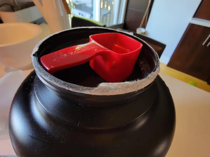 2. “My Protein Powder Scoop Is Designed To Sit On A Lip Just Under The Lid… So You Don’t Have To Reach Into The Powder To Grab It.”