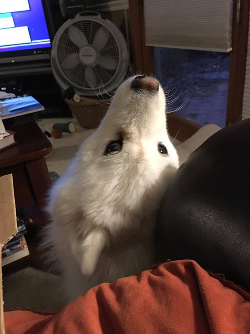 31. “My Samoyed Thinks If She’s Not Facing Me When I’m Eating, She’s Not Being Rude (She Knows Begging Isn’t Allowed). This Is Her Compromise”