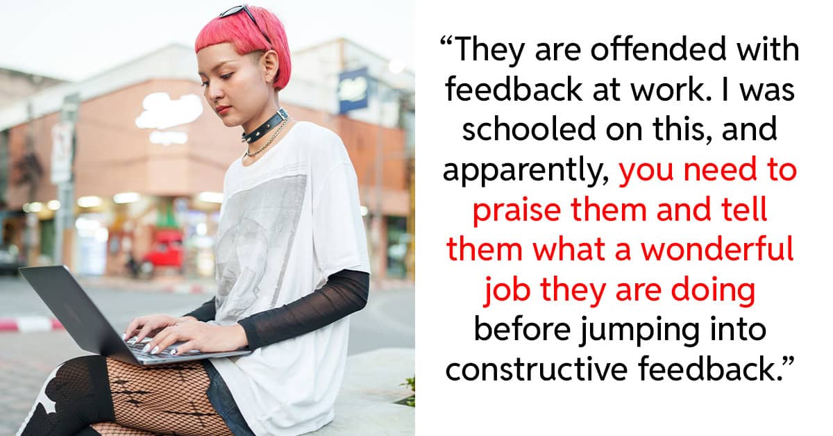 “They are offended with feedback at work. I was schooled on this, and apparently, you need to praise them and tell them what a wonderful job they are doing before jumping into constructive feedback. Even for the smallest of things. Oh, and you can’t put a full-stop at the end of your sentence on chat, as it comes across as passive aggressive. They instead want you to end sentences with an emoji — it doesn’t matter which, as long as it’s not a period.” – Anonymous, 44