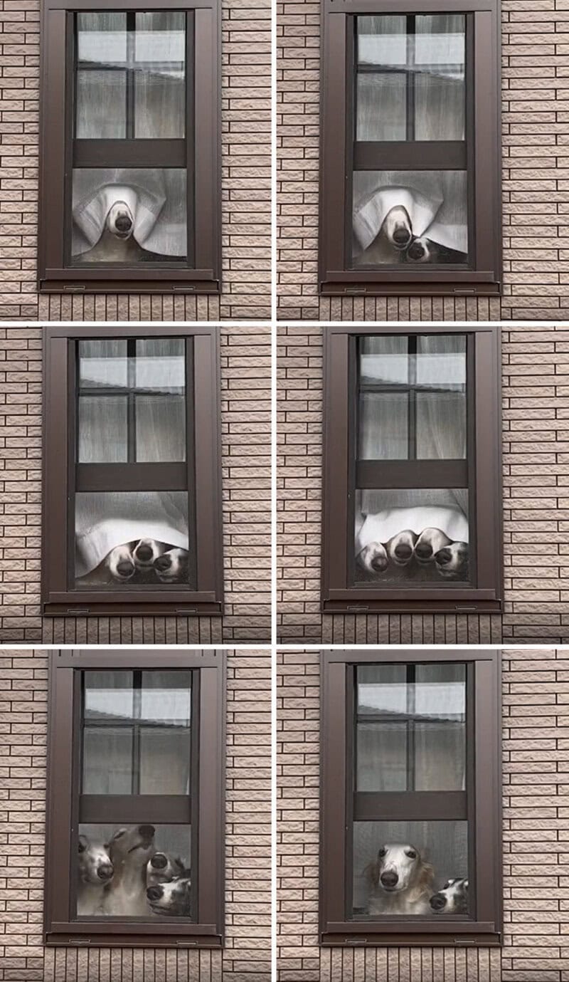 2. “Four Borzoi Dogs Adorably Peek Their Big Noses Out Of Curtained Window One At A Time”