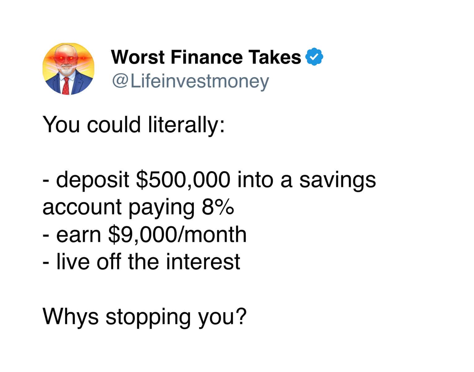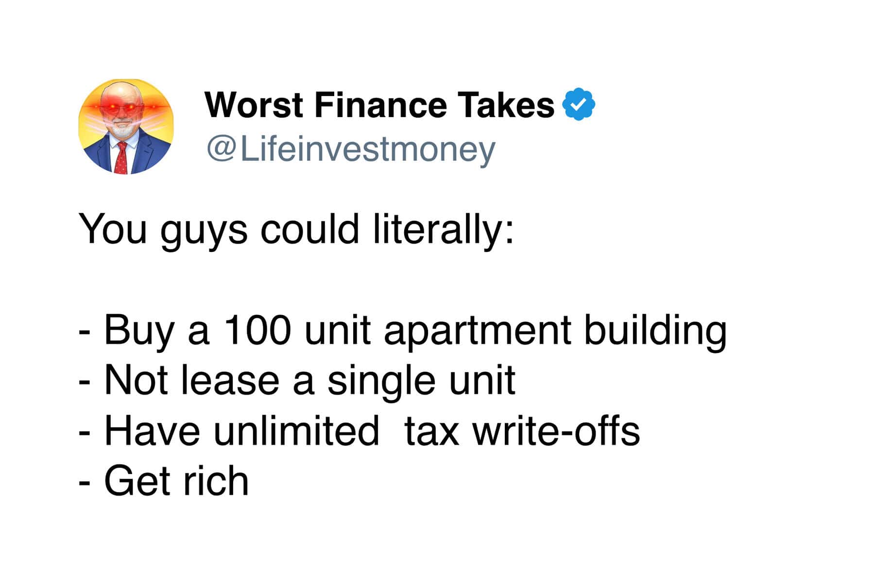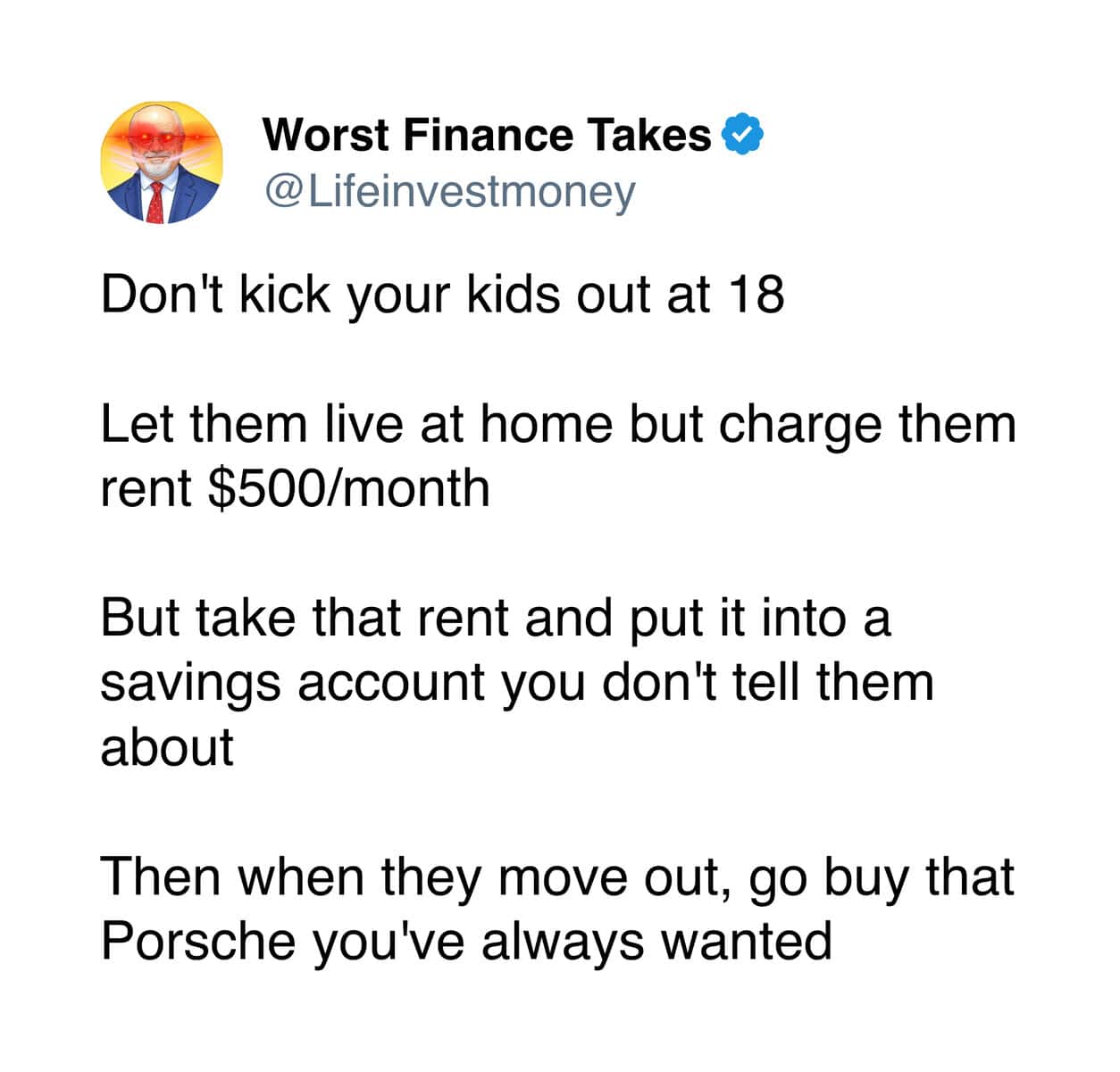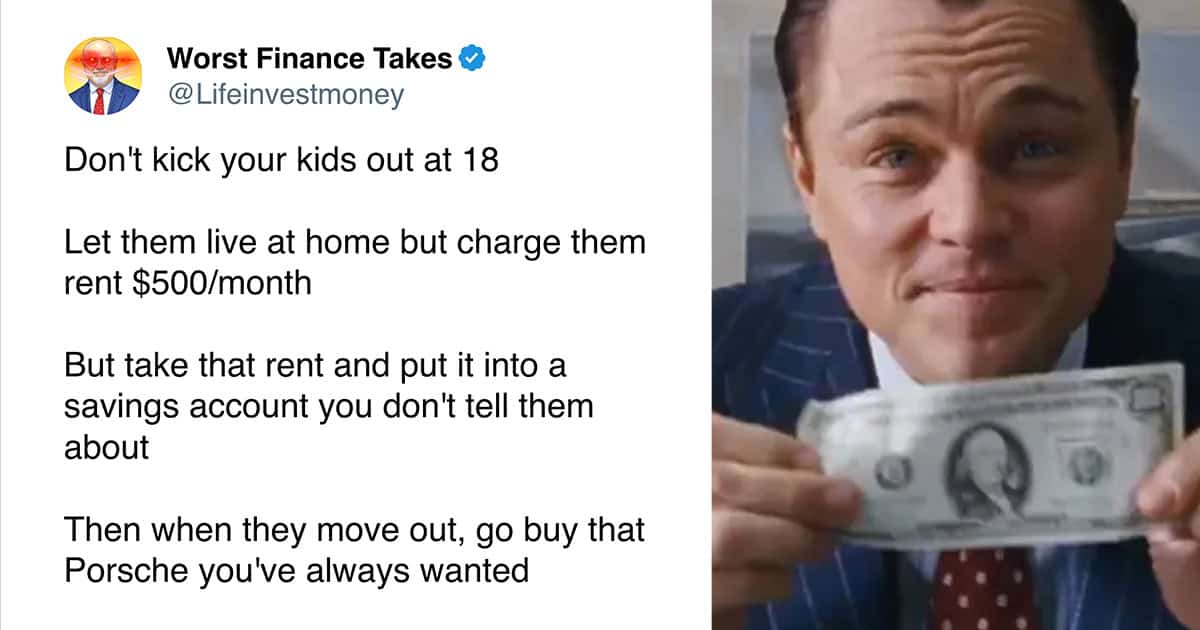 Even with that extremely limited knowledge, I can confidently say the advice from the Worst Finance Takes account is completely unhinged. Like, so bad it circles back around to being impressive.