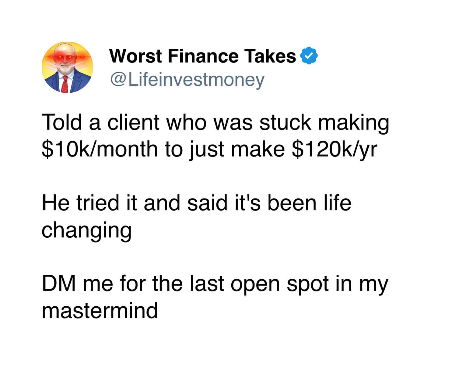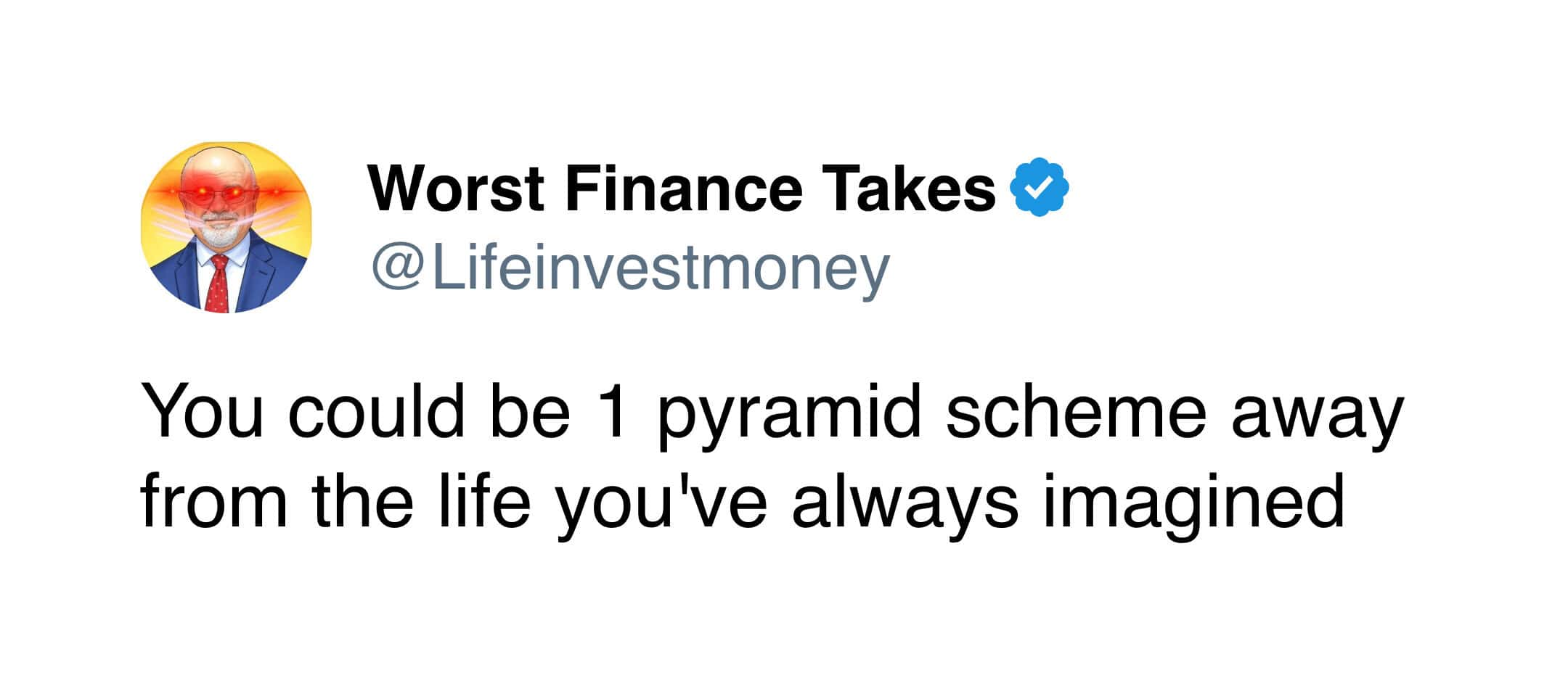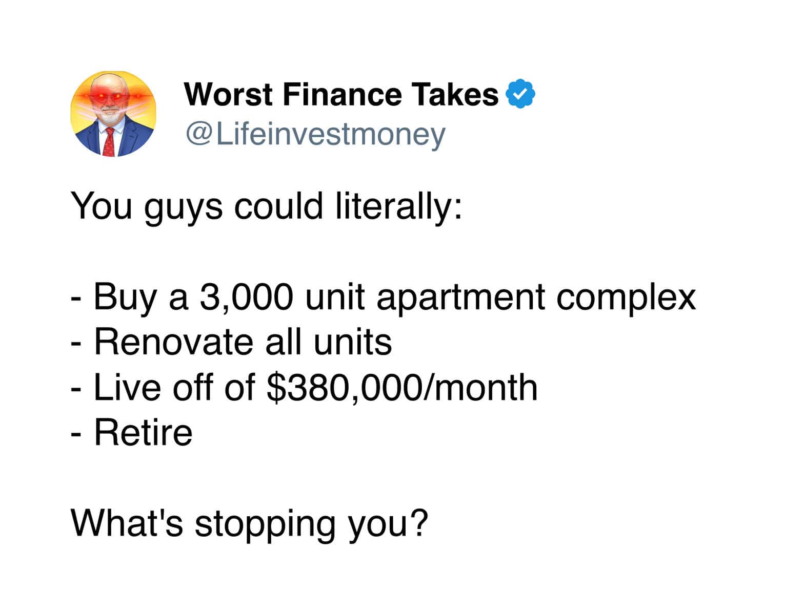Even with that extremely limited knowledge, I can confidently say the advice from the Worst Finance Takes account is completely unhinged. Like, so bad it circles back around to being impressive.