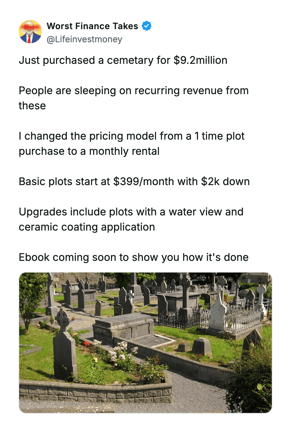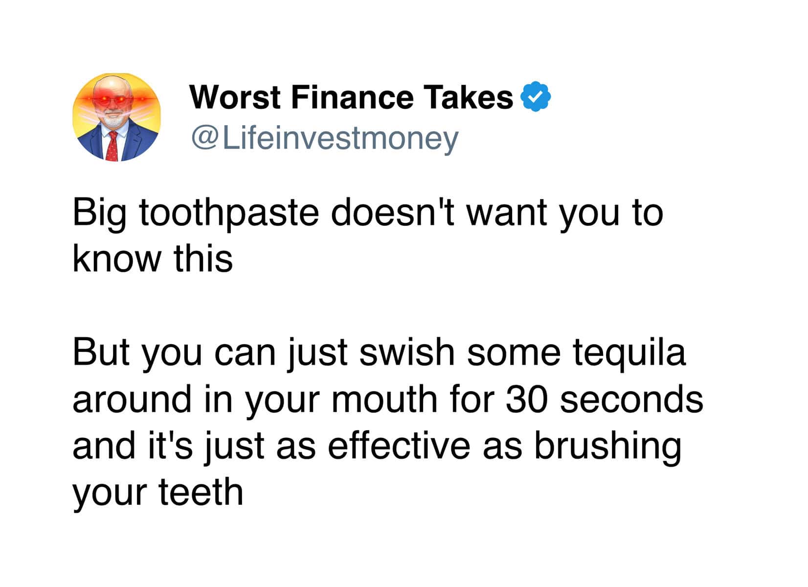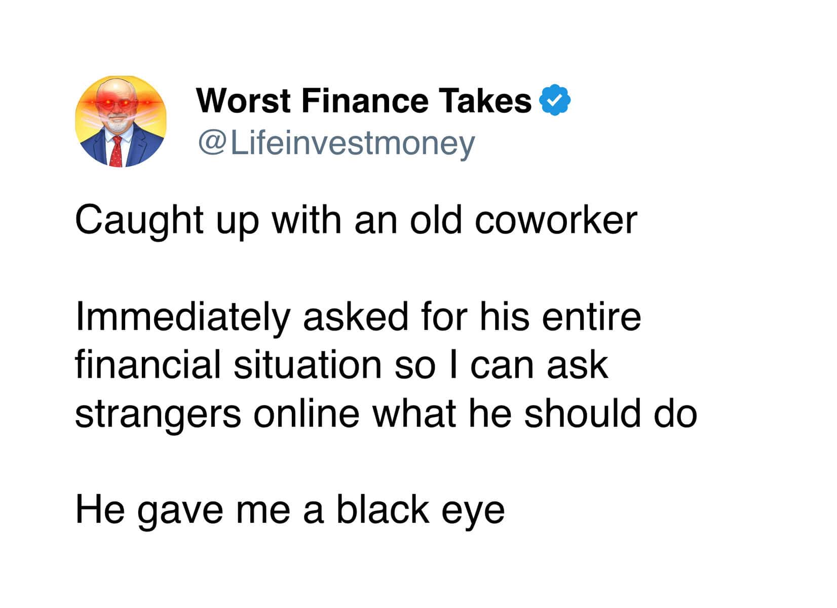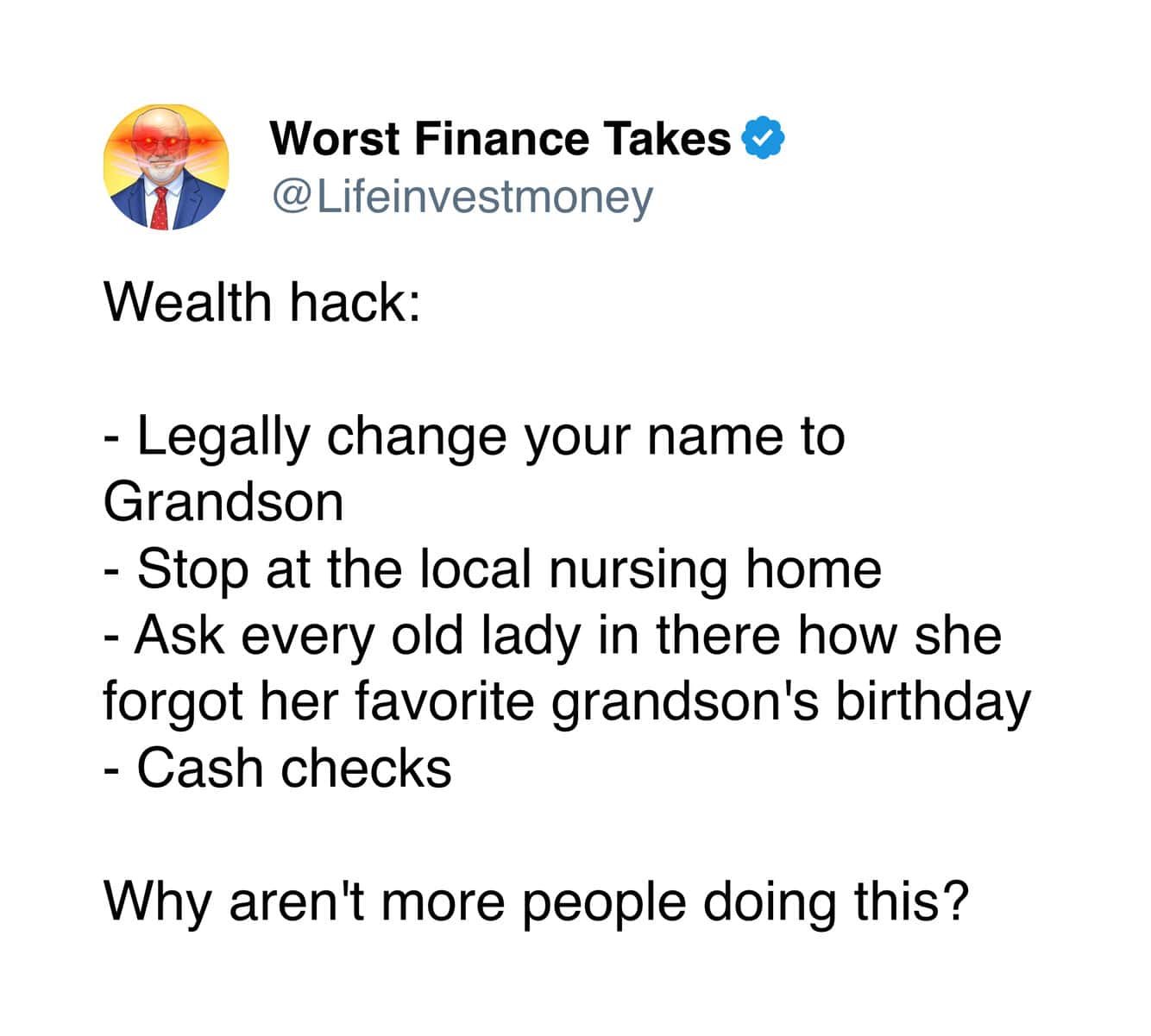 Even with that extremely limited knowledge, I can confidently say the advice from the Worst Finance Takes account is completely unhinged. Like, so bad it circles back around to being impressive.